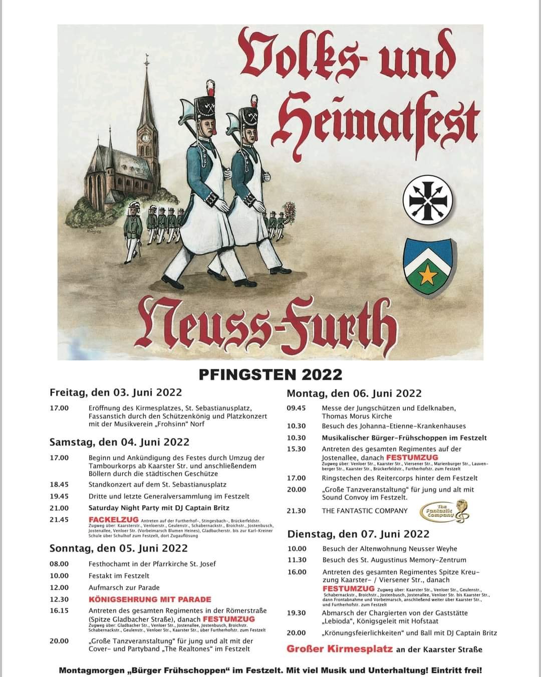 Bilder von der Furth im Jahr 2025 und dem Neusser-Bürger-Schützenfest 2025. Links das Festplakat für die Furth; rechts das Symbol "Endlich wieder" für das NBS. Einfach anklicken. |