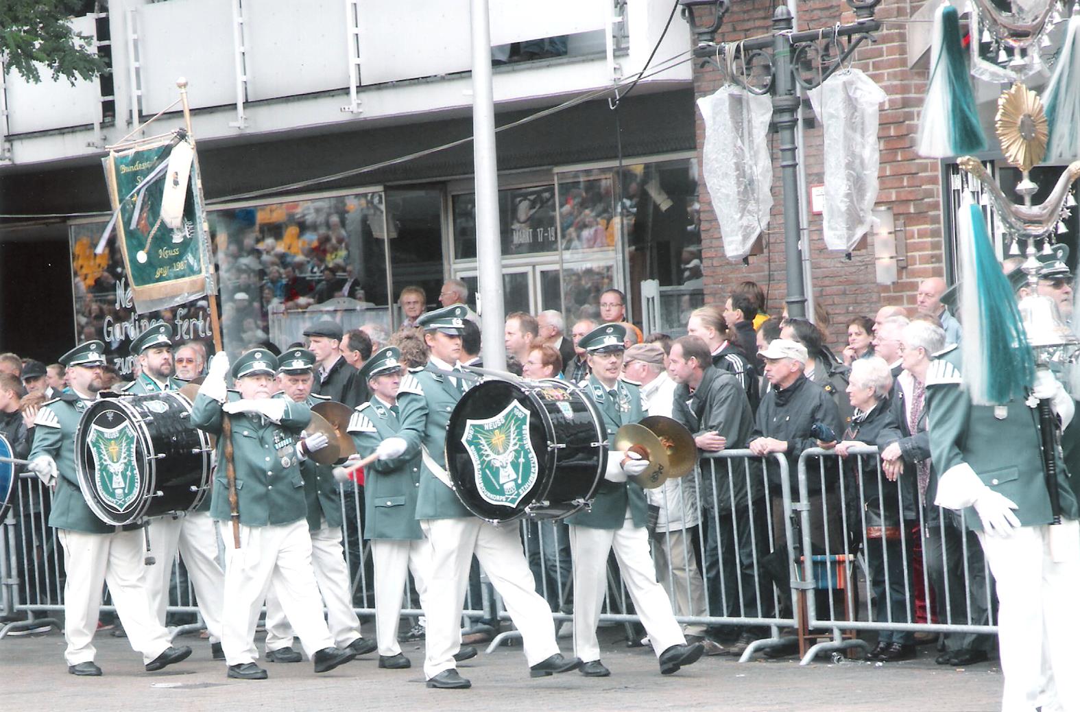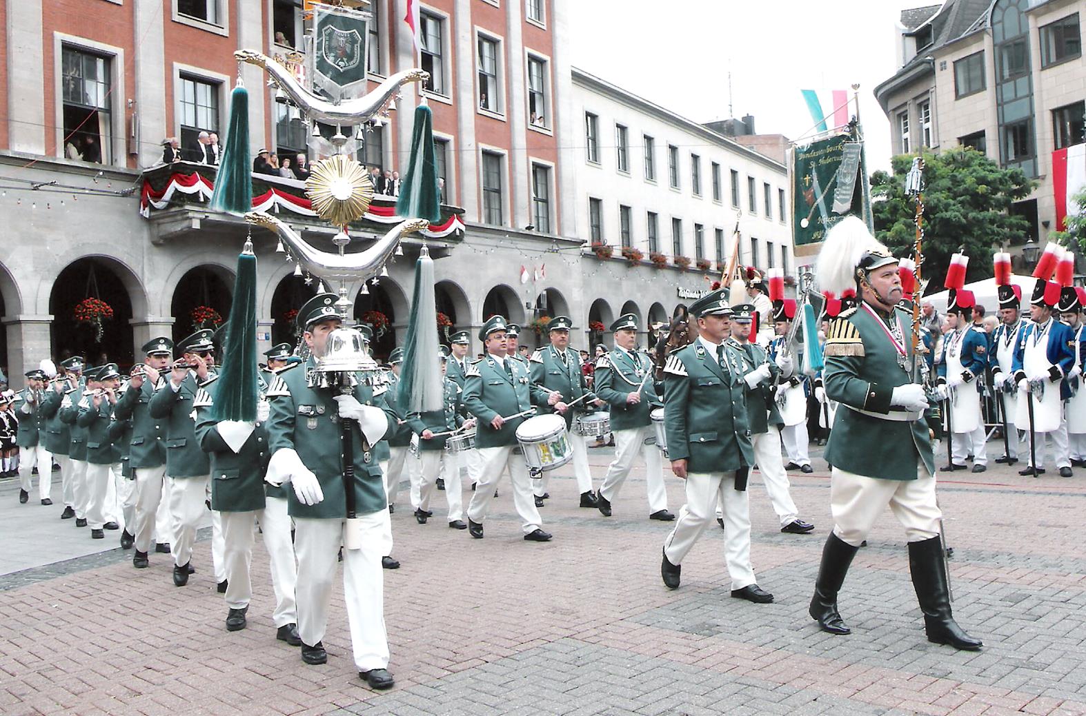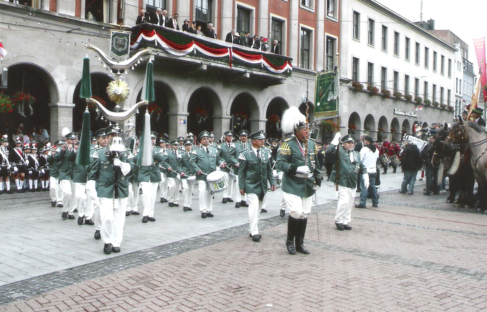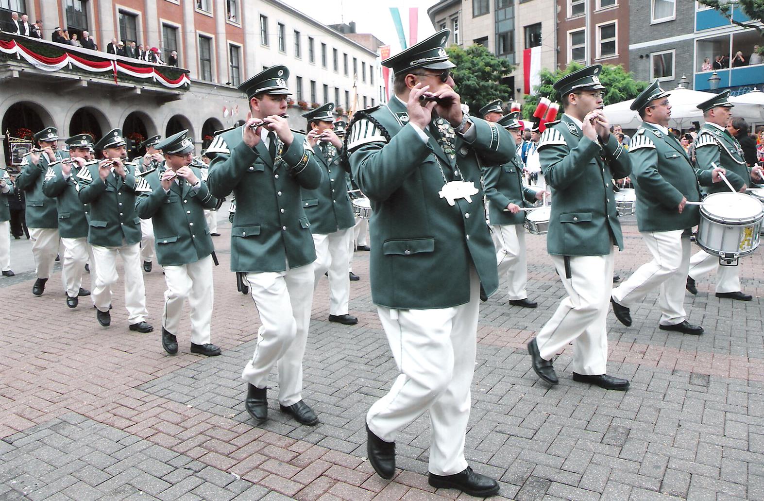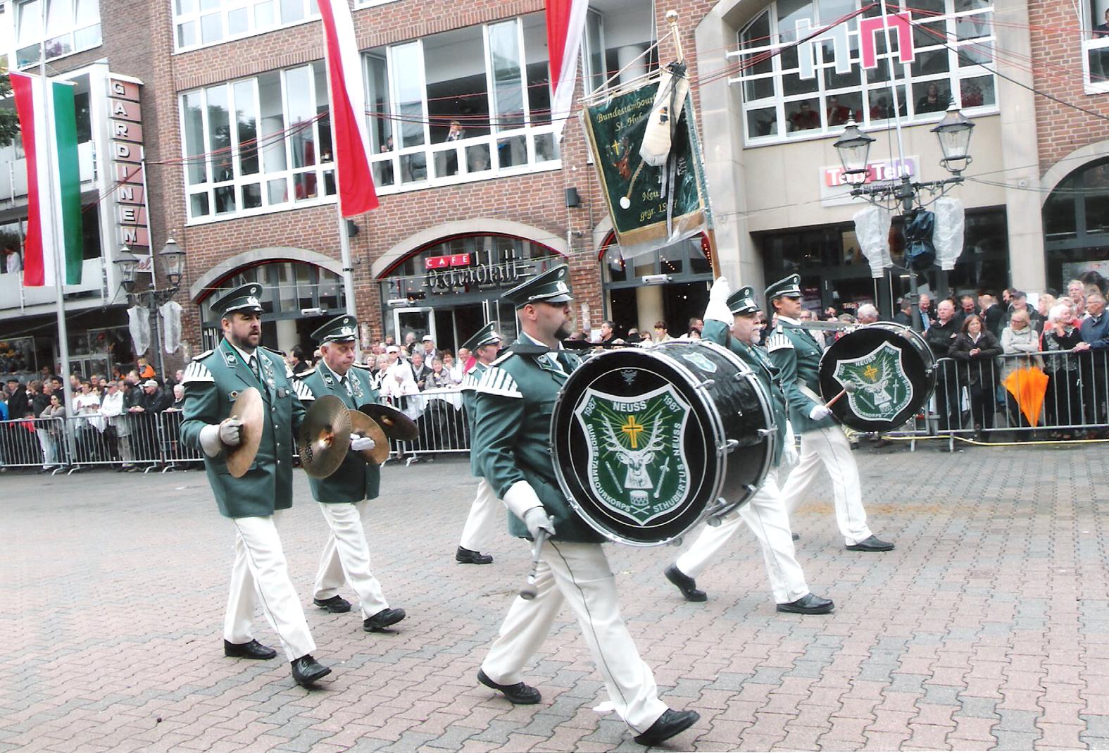 Das Bundestambourkorps St. Hubertus Neuss, 1987 und die Neusser Ratsbläser beim Abmarsch vom Markt im Jahr 2011