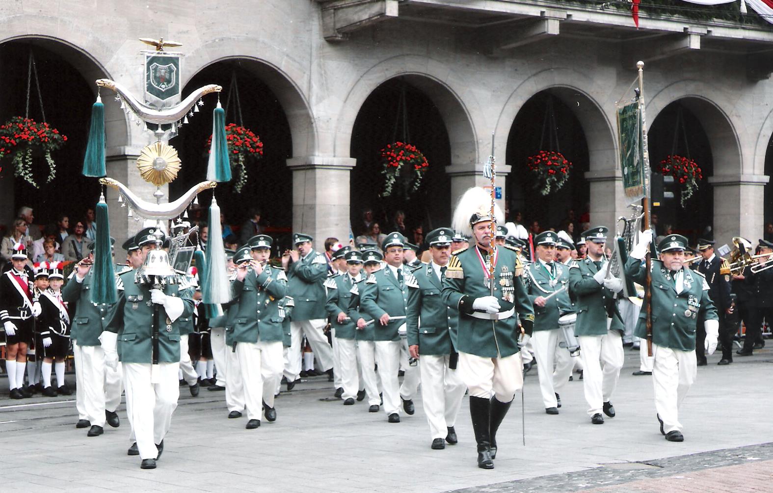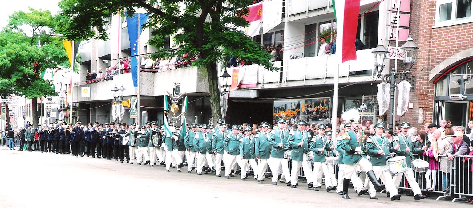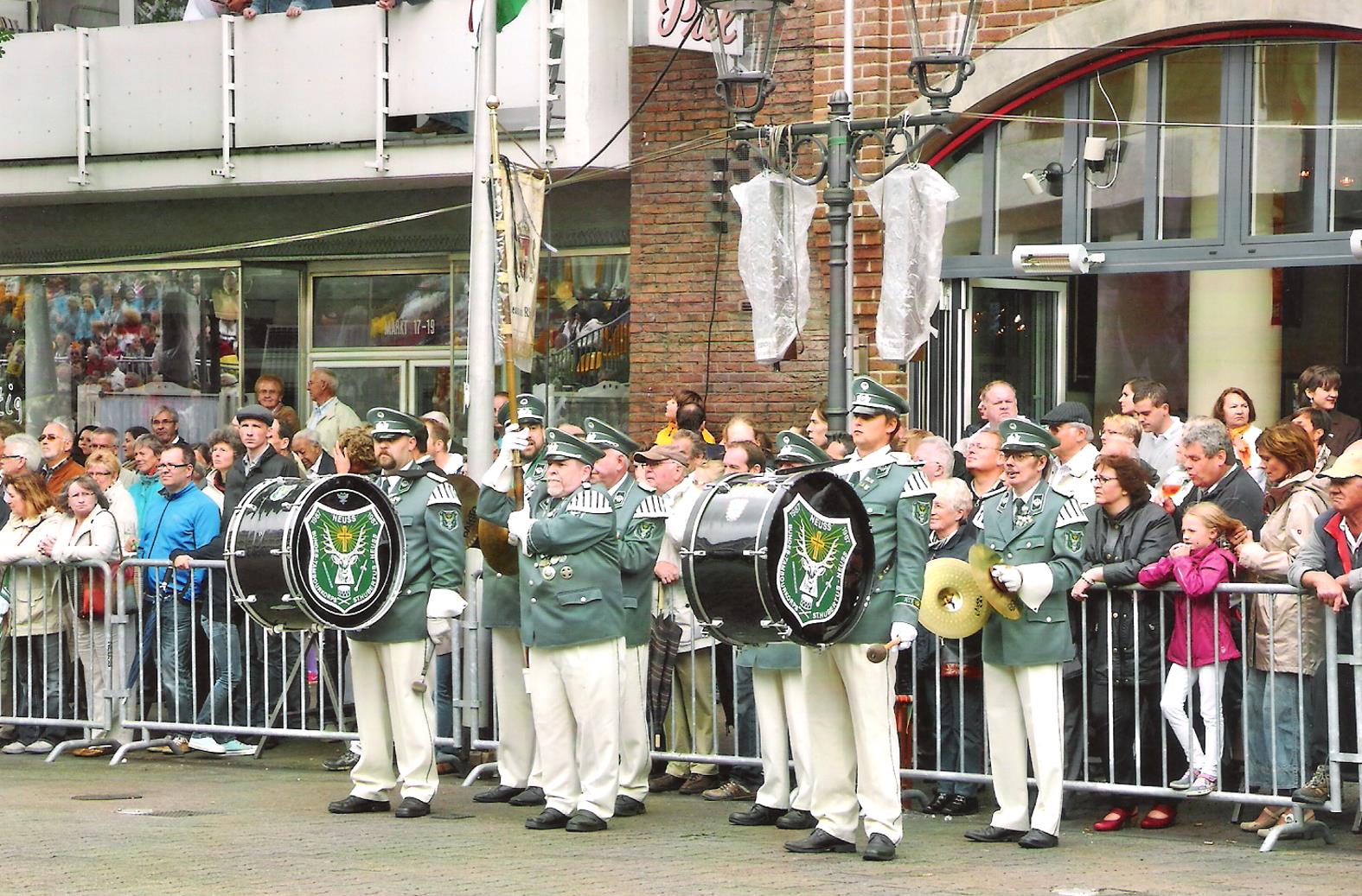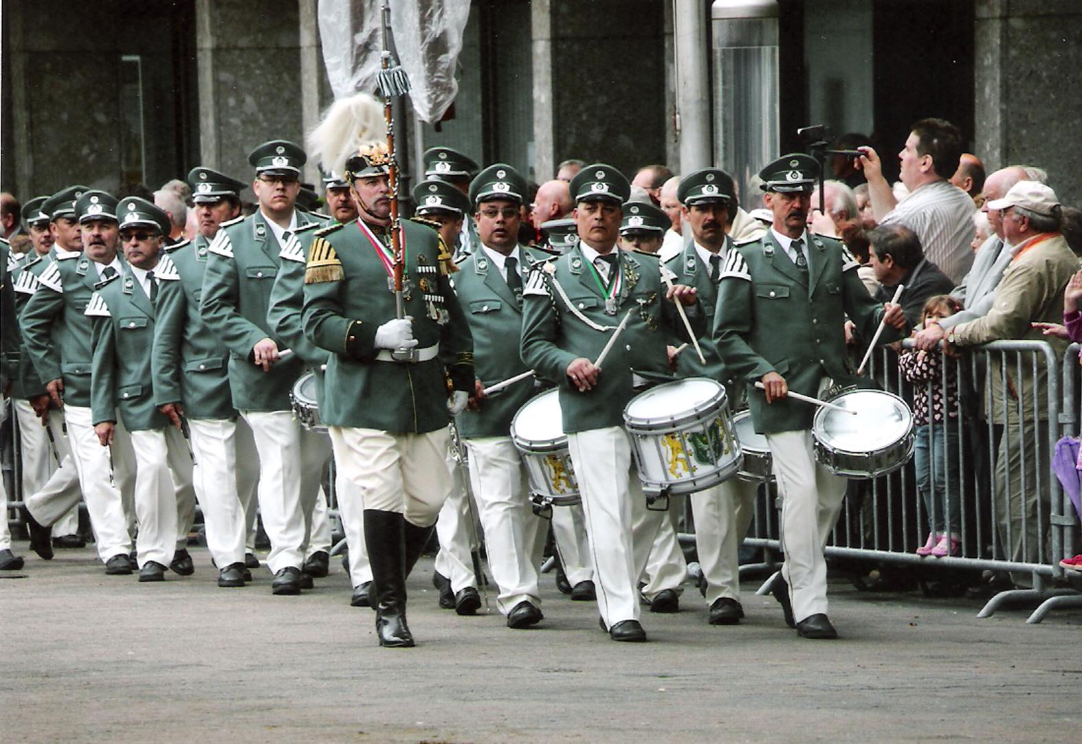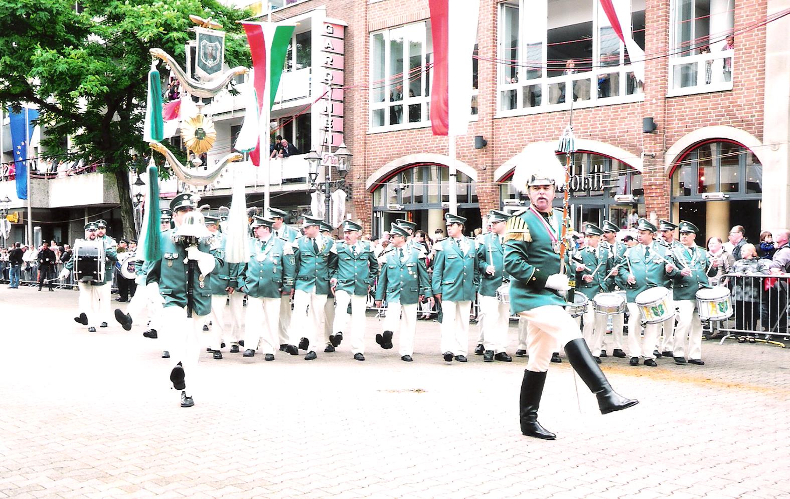 Das Bundestambourkorps St. Hubertus Neuss, 1987 und die Neusser Ratsbläser beim Abmarsch vom Markt im Jahr 2011