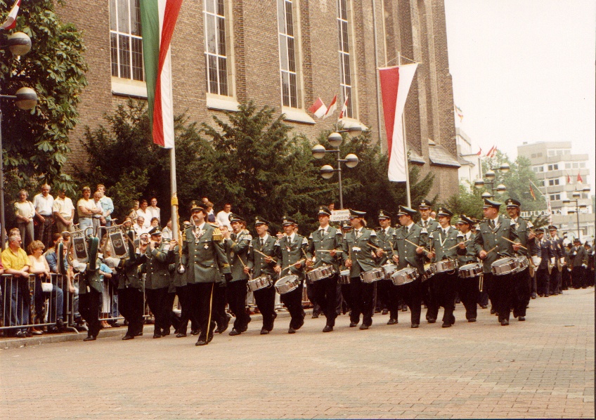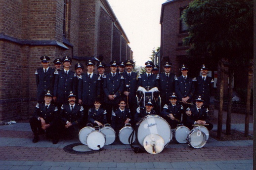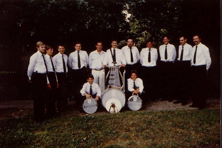 Das 1. Gruppenbild eines neugegründeten Tambourkorps. Gefertigt im Sommer1987 bei einem Straßenfest im Dreikönigenviertel. Mit dabei Hubertuskönig Thomas Mann. | Der 1. Auftritt in eigener Uniform beim Further Schützenfest im Jahre 1988. Aufgenommen neben der Kirche St. Josef auf der Gladbacher Str. |